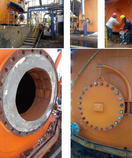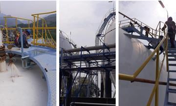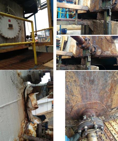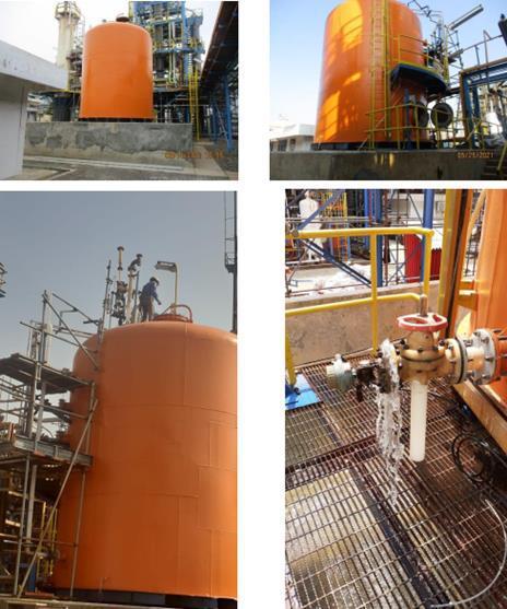 Kami melakukan repair terhadap Tangki yang mengalami berkarat parah pada semua zozzle dan beberapa  bagian dinding tangki akibat kebocoran fluida. Lingkup pekerjaan yang kami kerjakan adalah ganti nozzle dan  pad, repair base plate, repair platform, ganti handrail, ganti support tangki, repair pondasi tangki dan repainting  tangki.