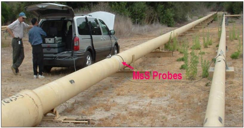 Kami menggunakan sensor magnetostrictive (MsS) karena sangat baik dan diakui secara global untuk inspeksi pipa yang dapat menjangkau jarak panjang (long range). Sensor MsS dapat dengan mudah memeriksa cacat yang terletak di pipa yang mengandung fluida, bengkok atau terkubur di bawah tanah maupun beton.
